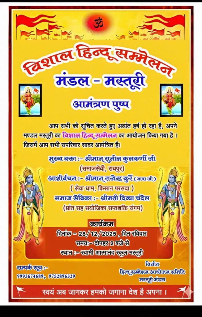 मस्तूरी में सर्व हिन्दू समाज का विशाल सम्मेलन आयोजित होने जा रहा है, जो पूरे मंडल के हिन्दू भाई-बहनों के लिए एक महत्वपूर्ण आयोजन है। यह कार्यक्रम 28 दिसंबर रविवार को दोपहर 2 बजे से प्रारंभ होगा। इस आयोजन में महिलाओं, बच्चों और पूरे हिन्दू परिवार का समागम संभव हो सकेगा। मुख्य वक्ताओं में समाजसेवी सुनीता कुलकर्णी रायपुर, राजेंद्र कुर्रे सेवा धाम, किसान परसदा, दिब्या चंदेल प्रांत सह संयोजिका सप्तशक्ति संगम शामिल होंगे। इस कार्यक्रम की तैयारियां जोरों पर हैं और हजारों की संख्या में हिन्दू समाज के लोग इसमें भाग लेने की उम्मीद जता रहे हैं।
